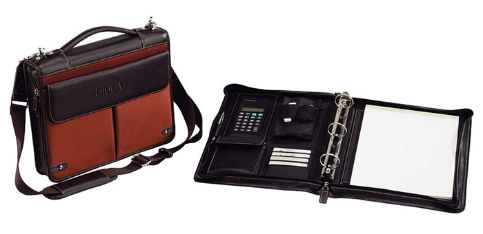 Leather portfolios have room for your pens, pencils, writing pads, loose-leaf papers, business pads, calculators and more. Have leather padfolios imprinted with your custom logo or text. Leather organizers help create a clutter free area in your house and at work.